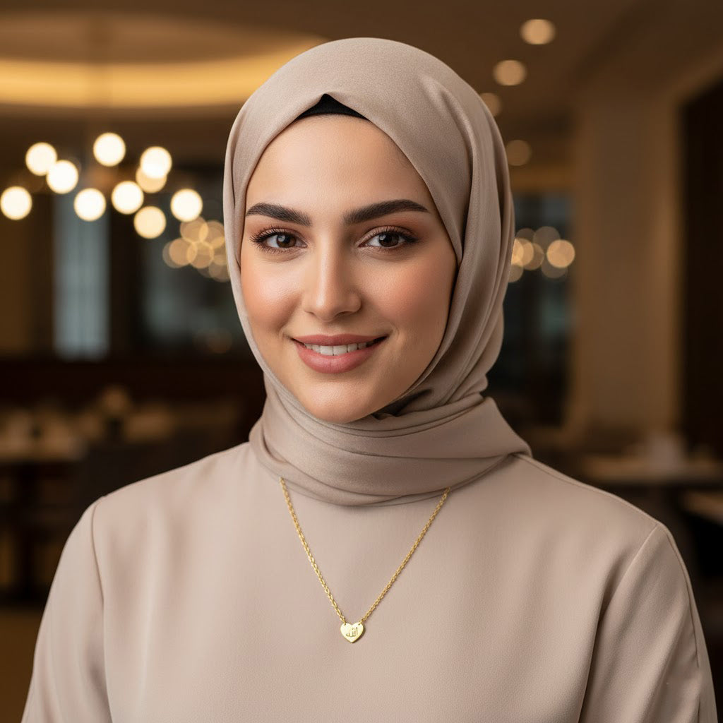 This charming necklace features a heart-shaped pendant engraved with the Arabic word “Allah,” symbolizing love and faith. The gold-tone finish and fine chain combine for a soft yet elegant look, making it a meaningful accessory for both daily wear and special occasions. It’s the perfect way to carry a reminder of love and devotion wherever you go.