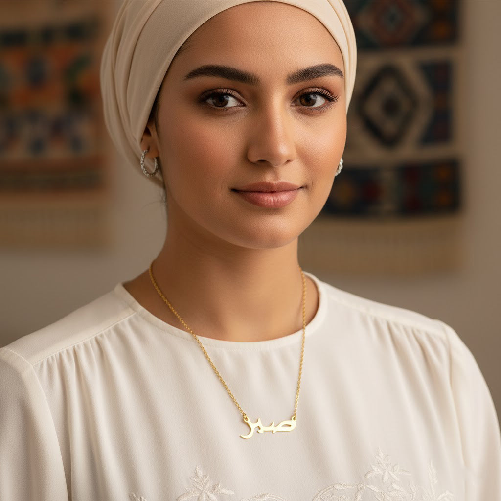 This elegant necklace showcases the Arabic word “Sabr,” meaning patience, delicately crafted in sleek gold-tone calligraphy. A graceful reminder of resilience and inner peace, this minimalist piece pairs effortlessly with any outfit. The fine chain and polished finish make it a perfect everyday accessory or a heartfelt gift of encouragement.